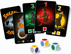 Risiko trifft Würfelglück. Auf dieses profane Motto ließe sich Sneaky verknappen. Die Geschichte, die mit dem kleinen Spiel erzählt wird, ist jedoch viel schöner. Hier darfst du nach Herzenslust wieder einmal ein Böser oder eine Böse sein, konkret räubern, was das Zeug hält. Du sammelst nämlich Räuber in Form von Karten in sechs Farben. Dazu gibt es sieben Farbwürfel, die du zu Beginn deines Zugs schmeißst. Würfel, die zu den drei Räubern in der Tischmitte passen, kannst du auf die entsprechenden Karten legen. Räuber mit nur einem geforderten Würfel nimmst du gleich zu dir, die sind dir sicher. Räuber mit zwei oder drei abverlangten Würfeln kannst du auch nehmen, sie können dir jedoch noch von anderen geraubt werden. Du legst sie nämlich offen auf einen Stapel vor dir, auf den die anderen ihre Würfel legen dürfen. Denn es liegt prinzipiell an dir, ob du deine Würfel in der Auslage in der Tischmitte – immer drei Karten – einsetzt oder Beute bei Mitspielern machen willst.