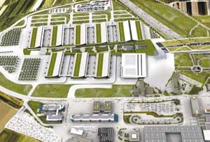 Direkt am Flughafen (unten) und an der A8 (rechts) liegt das neue Stuttgarter Messegelände.