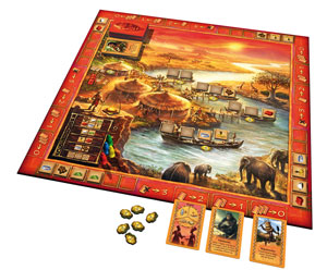 Bleiben wir in Afrika, dingen aber mehr in Richtung Süden vor. Waka Waka ist eines der "großen" Kosmos-Spiele in diesem Jahr. Autor ist Rüdiger Dorn. Ihm haben wir unter anderem das exzellente Jambo zu verdanken, und einige Elemente davon finden sich in Waka Waka wieder. Hier wie dort geht es nämlich um Handel am Schwarzen Kontintent. Nur nicht nur für zwei Spieler, sondern für 2 bis 4. Die Spieler kaufen Waren, um bestimmte Aufträge zu erfüllen. Dabei helfen unterschiedliche Personen mit ihren besonderen Fähigkeiten. Für jeden erledigten Auftrag steigt man im Status auf. Pohl & Rick haben dazu ein äußerst stimmungsreiches Spielbrett gestaltet (Bild rechts).