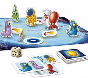 „Heute ist wirklich ein verrückter Tag im Universum. Die Aliens sind schnell zu einem wichtigen Treffen geflogen, aber… oh weh! … Ein Ufo wurde beschädigt und brach zusammen. Die Aliens fielen aus dem Raumschiff und wissen nun nicht, wie sie sich mit den anderen Bewohnern des Weltraums treffen können. Helft ihnen!“ Das ist die Ansage bei UFO Boom (ab 6), einem Laufspiel, bei dem Figuren zusammengebracht werden sollen, wobei natürlich Hindernisse im Weg sind. Autor ist Tom Schoeps.