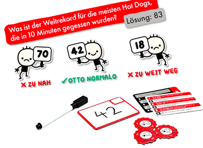 Der sprichwörtliche Otto Normalverbraucher ist im Englischen der Average Joe. So heißt auch das Originalspiel, das Piatnik als Otto Normalo lokalisiert hat. Worum geht’s? Raten, was der Weltrekord im Hot Dog-Essen sein könnte. Zum Beispiel. Es punktet, wer nicht zu nah und nicht zu weit am Ergebnis ist. 525 Fragen sollten eine Weile reichen …