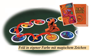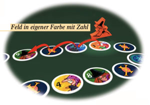 Das Wegstück zeigt die Farbe des eigenen Clans sowie eine Zahl. Die Hexe muss die angegebene Zahl sofort weiterziehen oder stehenbleiben, wenn das betroffene Feld schon besetzt wäre. |