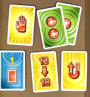Das sind die nicht gewöhnlichen Karten im Spiel (im Uhrzeigersinn): Mit der Hand darf man in eine Karte, die man später erhält, ablehnen; die grünen Pluspunktekarten werden nicht in die Auslage, sondern sofort als Gewinn zur Seite gelegt; wer die Karte mit dem Pfeil erhält, muss sie zusammen mit der zuletzt abgelegten Karte auf den Ablagestapel legen; Mit 13 auf 18 wird der Spielraum erhöht – 18 ist das neue Maximum für den betreffenden Spieler; solche blauen Karten müssen in die Auslage gelegt und zusätzlich eine weitere vom Stapel gezogen werden, deren Symbol (Anweisung) sofort ausgeführt werden muss. Fotos: Spielwiese |