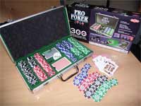 Der elegante Aluminiumkoffer enthält ein hochwertiges Poker-Set, das aus 300 zweifärbigen, 11,5 Gramm schweren Profi-Pokerchips und zwei Paketen Spielkarten mit je 55 Blatt in bester Casino-Qualität besteht.