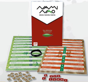 Nami Nao ist nach Angaben des Verlags ein Legespiel für Jung und Alt - treffender ist wohl Sammelspiel. Das doppelseitige Spielbrett besteht zum Einen aus biblischen Tieren und zum anderen aus biblischen Personen.