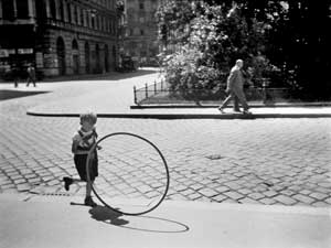 Reifen treiben, um1935 , Fotografie von Rudolf Spiegel . Die Ausstellung spannt einen sehr weiten Bogen, was Spiel in der Stadt alles war und ist. © Bezirksmuseum Ottakring |