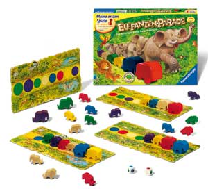 Bei Elefantenparade, einem Spiel für Kinder von Ravensburger, ist die Welt dafür noch in Ordnung. Bis zu vier Spieler wollen die Vertreter von vier Elefantenfamilien möglichst schnell in eine Reihe bringen. Dazu hat jeder Spieler ein eigenes Spielbrett. Man wirft spezielle Würfel und holt sich die entsprechenden Elefanten aus dem allgemeinen Vorrat in der Tischmitte. Dabei müssen die Größenabstimmung und die Farbfelder eingehalten werden.