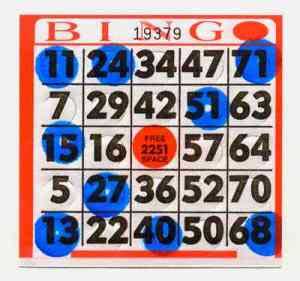 | Im Gegensatz zu unserem Lotto erwirbt man bei Bingo einen Zettel mit bereits vorgedruckten Zahlen und deckt die aufgerufenen Zahlen ab. Wer damit Reihen schafft, ruft "Bingo!".