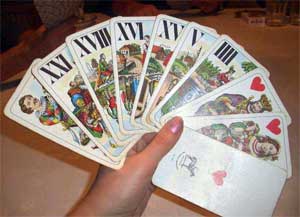 | Die Tarock-Karten haben eine gemeinsame Geschichte mit jenen, die auch zum Wahrsagen hergenommen werden. Zur besseren Unterscheidung hat man sich im deutschen Sprachgebiet darauf verständigt, die Kartenspielfamilie Tarock zu nennen und alle Aspekte, die mit Esoterik zu tun haben, als Tarot zu bezeichnen.