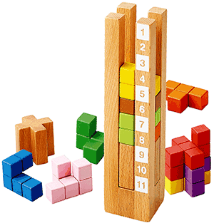 In der Logicus-Reihe ist im März Colour up erschienen, ein sofort einnehmendes Denk- und Stapelspiel, weil alles aus Holz ist, auch der spezielle Turm, in den ein oder mehrere Spieler in unterschiedlichen Schwierigkeitsgraden bunte Holzstücke verbauen müssen.