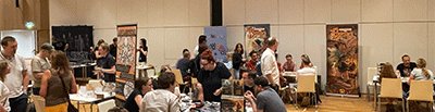 | Die Zahl der Spieleverlage, die beim Spielefest in Wien dabei sind, ist dieses Jahr gewachsen. Fast überall konnten die Spiele auch an speziellen Spieltischen ausprobiert werden: Eine Firma, die sich darauf spezialisiert hat, hat den Verlagen die Tische zur Verfügung gestellt. |