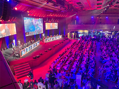 | Darauf wollen wir nicht vergessen: Dass es wieder ein großes Spielefest in Wien gibt, das diesen Namen auch verdient, ist den Machern des E-Sport-Festivals zu verdanken. Allein im großen Saal des ACV können an die 500 Besucherinnen und Besucher ihre Bildschirmheroen vorne auf der Bühne bei den Battles anfeuern. |