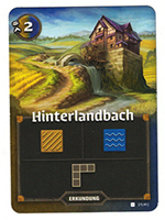 Als zweite in unserem fiktiven Beispiel wird die Erkundungskarte "Hinterlandbach" aufgedeckt (Bild rechts). Zahl: 2 – der Frühling ist nun schon drei von acht „Zeiteinheiten" alt. Dieses Mal ist die Landschaftsform vorgegeben, dafür darf zwischen Gebirge ind Wasser gewählt werden.