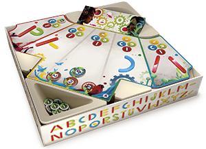 Aber wenden wir uns jetzt dem eigentlichen Spiel zu. Auch hier bleibt jeder Schritt schlüssig. Zuerst: Der Rätselsteller wählt sein Wort und legt die Buchstabenteile in seine geheime Mulde. Da die Buchstabenplättchen schon den „Aufbau“ aus den vier Grundformen zeigen, sollte das keine Hürde sein. Der Rätselsteller nimmt ein Buchstabenteil und gibt es dem ersten ratenden Mitspieler. Die Spielfläche ist so unterteilt, dass für jeden Buchstaben des gesuchten Wortes ein eigenes großes Feld, die Buchstabenzone vorhanden ist. Der Ratende sucht sich eine aus: Kommt, zum Beispiel, das rote gerade Buchstabenteil im zweiten Buchstaben des Wortes vor? Wenn ja, wird es in die entsprechende Buchstabenzone gelegt. Der nächste Spieler ist an der Reihe. Falls nein, wird die Buchstabenzone mit einem Nein-Marker belegt. Der Spieler am Zug versucht es in einer anderen Buchstabenzone.