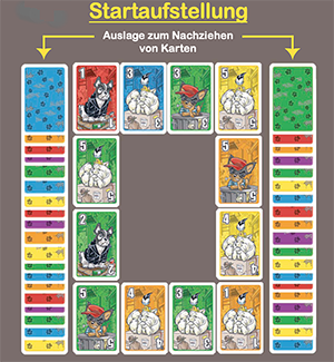 Die Ausgangslage: 12 Karten werden zu Beginn als Karree ausgelegt, so dass vier „Felder“ in der Mitte leer bleiben. Der Spieler an der Reihe legt eine Karte in diesen Leerraum, die Karte muss dabei an zwei (später kann das auch nur eine Karte sein) angrenzen. Das bild rechts oben mach das klar. Jetzt wird geschaut: Ergeben die Zahlenwerte in der Reihe oder Spalte mindestens die Summe von 10, dann darf der Spieler Karten kassieren. Nämlich jene, die in der Reihe oder Spalte entweder die gleiche Farbe wie die ausgespielte Karte haben oder die gleiche Hunderasse wie die ausgespielte Karte zeigen.