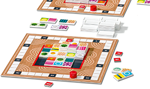Jeder Spieler hat ein Tableau vor sich, das abstrahiert eine Holzbox darstellt. Es gibt zwei unterschiedlich bedruckte Seiten. Dort sind einmal acht bzw. vier Felder schon mit einer der Zutaten vorgedruckt. Wer an der Reihe ist, legt einen Dominostein. So wächst das Spiel in die Breite, aber auch in die Höhe, wobei beim Überdecken immer zumindest eine Zutat (ein Dominostein hat ja zwei „Bilder“) mit der direkt darunter befindlichen übereinstimmen muss. Gelingt es, damit zwei gleiche Zutaten zu überdecken, bringt das fünf Sonderpunkte. Ansonsten wird so gepunktet, und dabei ist wichtig: Die Zutaten, die abgerechnet werden, müssen auf dem Tableau nicht zusammenhängen: Man entscheidet sich für eine der beiden Zutaten, die man gerade gelegt hat, und alle, die jetzt von oben sichtbar sind, bringen einen Punkt.