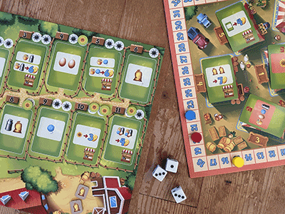 My Farm Shop ist ein Sammel- und Wirtschaftsspiel. Wer am Ende das meiste Geld besitzt, hat gewonnen. Jeder Spieler hat einen Bauernhof vor sich. Darauf sind zehn Felder mit verschiedenen landwirtschaftlichen Waren. Eier, Wolle, Milch und anderes sind auf den Feldern je nach Spieler etwas unterschiedlicher verteilt. Zu jedem Feld gehört eine Zahl von 2 bis 12, also Werten, die sich mit zwei Augenwürfeln erzielen lassen. Dazu noch später. Die beiden weiteren wichtigen Elemente sind der Markt in der Tischmitte sowie ein kleines Tableau namens Regal, von dem jeder Spieler ebenfalls eines vor sich hat.
