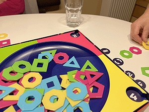 | Viel bunte Polygone liegen in der Schale. Man soll gleiche Formen oder gleiche Farben nehmen und sammeln. Welche Kombination man zusammenstellt bestimmt, ob man – wie hier – 4 oder 2 Punkte erhält. Bild: spielwiese.at |
