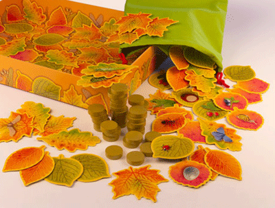 Gespielt wird mit Laubblättern aus dickem Karton. Und wenn wir hier von dick schreiben, dann meinen wir das auch genau so. Und sie schauen genau so aus, wie man es von Johann Rüttinger gewohnt ist (hier zusammen mit Sohn Paul). Einfach schön! Ein Dutzend dieser Eichen-, Ahorn-, Linden-, Buchen- und Espenblätter ist vorne und hinten gleich. Die kommen zu Beginn in die Schachtel, deren Boden genau mit solchen Blättern bedruckt ist. 43 Blätter aber zeigen auf der Rückseite einen Käfer, einen Feuersalamander, einen Kiefernzapfen, eine Beere oder sonst was, was sich am Waldboden unter einem Blatt verstecken könnte. Diese Blätter warten in einem Stoffbeutel.