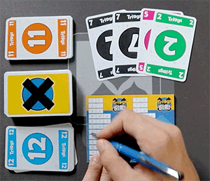 So läuft es auch bei Triggs. Nur ohne Würfel. Dafür gibt es stapelweise Zahlenkarten. Genauer gesagt 108 Zahlenkarten mit den Werten von 1 bis 12, zufällig aufgeteilt auf zwei offene und einen verdeckten Stapel. Fünf Zahlenkarten bekommt jeder zum Start auf die Hand. Und einen Zettel mit zwölf Reihen von 1 bis 12, wobei die Länge der einzelen Zahlenreihen mit ihrem Wert zunimmt. Was nun gemacht wird, ist sehr einfach, zieht aber einen schnell rein.