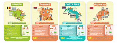 | Die Karten sind attraktiv und halten eine Menge Informationen zum Land bereit. Da die Schlüssselwörter variiert werden können, kann dasselbe Land auch mehrmals als Frageobjekt dienen. Bild: HCM Kinzel |