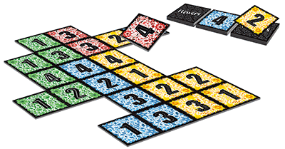 Wir haben insgesamt 108 kleine Kärtchen in vier Farben mit 1ern, 2ern, 3ern und 4ern. Es geht angeblich um schöne Blumenwiesen, tatsächlich aber bleibt Flowers abstrakt. Die Kärtchen werden auf drei Stapel verteilt, wobei einer immer ein verdeckter Nachziehstapel bleibt, während bei den beiden anderen die oberste Karte aufgedeckt ist. Aus diesen drei Stapeln darfst du wählen, wenn du an der Reihe bist. Das gewählte Kärtchen legst du dann vor dir in deiner eigenen Blumenwiese an oder du überdeckst damit ein bereits liegendes Kärtchen.