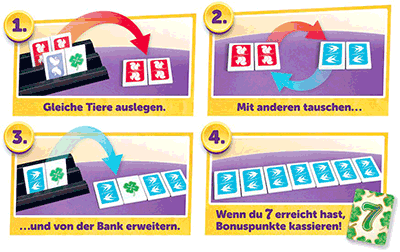 Anstelle von Zahlen haben wir hier acht Tiere in acht verschiedenen Farben sowie drei Spielsteine mit einem Kleeblatt als Joker. Zwei gleiche Tiere auf der Bank können bereits ausgelegt werden. Mehr sowieso. Namensgebend ist, mit der Zeit mindestens sieben Tiere einer Sorte (Farbe) ausgelegt zu haben. Das bringt einen Zusatzpunkt und dich dem Spielende und dem Sieg schon deutlich näher. Wer zuerst zwei Tierfamilien mit mindestens sieben Mitgliedern ausgelegt hat, ist fertig und hofft, dass einen die anderen nicht mehr bei den Punkten übertreffen. Sie kommen nämlich genau noch einmal an die Reihe. Jeder abgelegte Spielstein zählt einen Punkt. Ganz einfach.