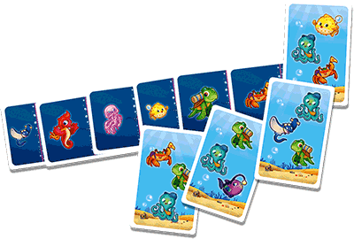 | Sobald auf den vier Karten eines Kindes vier gleiche Tiere zu sehen sind – hier ist es der Krake –, gibt es die entsprechende Wertungskarte (dunkel). Bild: Schmidt |
