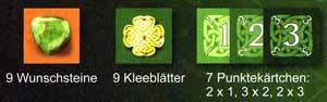 Die Punktekärtchen haben Ziffern von 1, 2 oder 3 und um diesen Wert rückt ein Spieler seinen Wertungsstein vor. Auch ganz nett, aber lange nicht so effektiv wie die Kleeblätter. Denn wir hatten bei den Testspielen sowohl Partien, die mit sehr knappen Punkteunterschieden geendet haben, als auch solche mit großen Abständen.