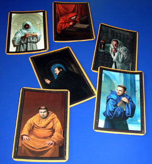 | Jeder Spieler hat eine der sechs Idenititäten – aber natürlich weiß nur er, welche. Egal wie viele mitspielen, die Figuren aller Mönche sind im Spiel. | |