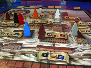 | Atmosphärisch sehr dicht: Der Spielplan von Der Name der Rose. Die Spieler bewegen die Figuren von Gebäude zu Gebäude und erregen je nach Ziel mehr oder weniger Verdacht. Zugleich tritt dadurch ein Wertungs- und ein Zeitmechanismus in Kraft. | |