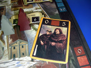 Gibt es allerdings kein Aufgabenplättchen in der Farbe des Mönches, dann macht er sich automatisch verdächtig. Der Verdacht wird in Form von Verdachtspunkten ausgesprochen: Die Zahlen der beiden (später vielleicht nur eines) Aufgabenplättchen werden addiert und um diese Summe wird der Zählstein des Mönches auf der Verdachtsleiste vorgerückt. So geht das reihum, bis einer der imaginären sechs Tage (=Runden) vorüber ist. Dann wird es ernst und man kommt der Stunde der Wahrheit näher. Wer auf der Verdachtsleiste am weitesten vorne steht, kassiert auf der Indizienleiste fünf Punkte, der zweite vier usw. Wie im wirklichen Leben: Ein Indiz wiegt schwerer als ein bloßer Verdacht.