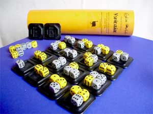Wieder einmal bekommt man bei Wittig einen Haufen Würfel in die Hand. Dazu aber auch 18 schwarze Kunststoff-Teile, die beidseitig verwendbar sind. Sie werden wie das Spiel Variominos genannt. Auf der einen Seite haben ein oder zwei Würfel in der Vertiefung Platz, auf der anderen vier Würfel.
