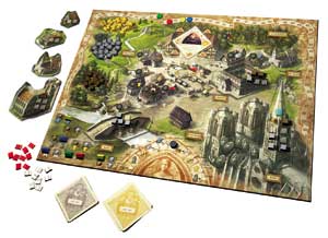 Schauen wir aber zuerst auf das Spielziel und den prinzipiellen Spielablauf. Es geht um die meisten Siegpunkte am Ende. Die Struktur geben vier Phasen im Spiel, die jeweil in sechs Runden unterteilt sind. Während dieser Zeitspanne – wobei hier die Jahre gemeint sind, über die sich der Roman streckt – bauen die Spieler Gebäude, kämpfen wie bei allen Entwicklungsspielen mit der künstlichen Verknappung von Rohstoffen und ähnlichem, und dann ereilt sie auch noch die Pest. Es gibt also Widrigkeiten zuhauf.
