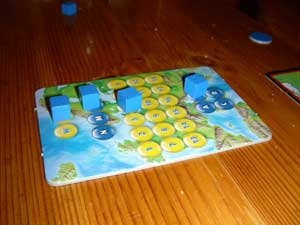 Nachzügler-freundlich ist auch die Regel, wie sich die Spieler ihre Aufgaben aussuchen. Wer mit seinen Punkten am weitesten hinten liegt, darf als Erster auswählen. Beim Start jeder Runde werden so viele Aufgabenkärtchen aufgedeckt und ausgelegt, wie Spieler teilnehmen. Da bleibt für die vermeintlichen und tatsächlichen Geografieprofessoren immer die schwierigste Aufgabe übrig. Beispielsweise das Nessebar aus dem Untertitel (Stadt und UNESCO-Weltkulturerbe in Bulgarien), die Verdonschlucht (Frankreich), der Malstrom (Norwegen) oder die Holzkirchen von Kischi Pogost (Russland). Die vier Aufgabenkarten sind auch Beispiele für die Kategorisierungen Rot (Orte), Grün (Landschaften), Gelb (geschichtsträchtige Orte) und Blau (Gewässer). Wer von jeder Sorte bis zum Ende mindestens eine Aufgabenkarte gesammelt = gefunden hat, erhält Zusatzpunkte. Zusatzpunkte kann man außerdem ergattern, wenn man bei einem Mitspieler dessen Suche noch vertieft, sprich: man weiß es genau und setzt einen zusätzlichen eigenen Tippstein auf dessen Tableau.