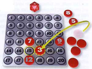 Jeder Mitspieler erhält dabei eine Zahlentafel und zwölf Zahlenchips seiner Lieblingsfarbe. Und dann geht es auch schon los mit würfeln. Der ungewohnte Zahlenwürfel liefert Zahlen zwischen 1 und 20. Nun nur noch einen der drei immer offen ausliegenden Zahlenchips aussuchen und auf dem gewürfelten Zahlenfeld der Zahlentafel platzieren. Wieder einen dritten Chip offen aufdecken, würfeln, platzieren.