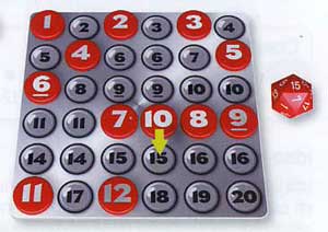 Das Versetzen: Alle Zahlensteine sind platziert, jetzt geht's ans Ordnung machen. Wieder wurde die 15 gewürfelt und ein bereits platzierter Zahlenstein muss auf ein 15er-Feld versetzt werden. In diesem Fall logischerweise die 10, womit der Spieler in diesem Beispiel alle zwölf Zahlensteine in die richtige Reihenfolge gebracht hätte. |