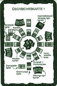 Einmal sind auf den Landschaftskarten Konfliktpunkte angegeben, und dann auf Versorgungskarten, die jeder Spieler ausspielen kann. Es gewinnt das Fürstenhaus, das mehr Punkte hat. Die unterlegene Landschaftskarte wird umgedreht und wechselt von Adler zu Rose oder umgekehrt.