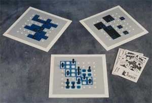 Auf dem selben Brett wird auch Tetrods gespielt. Von Alex Randolph als Solitärspiel ausgedacht, hat mit seiner Erlaubnis der Verleger Franjo Schulte ein Zweierspiel daraus gemacht. Und zwar ein sehr gutes! Ein Spieler hat 13 Holzpilze, der andere zwölf blaue Tetrods, das sind Kartonformen mit jeweils vier Feldern Grundfläche und einem Loch. Der Pilzspieler will Pilze nebeneinander pflanzen, der andere das verhindern. Dadurch, dass er ein Tetrod über den Pilz legt, so dass dieser aus dem Loch der Karton guckt. Damit ist zumindest ein Feld neben dem Pilz belegt, oft sind es auch mehrere.