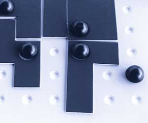 Für viele wird es trotz der entsetzlichen Karten Pegs sein. Hier hat man eine Art Lochkarten und Holzstifte. Sieben bis 14 Stifte werden anfangs beliebig gesteckt. Nun geht es darum, dass Karten nur dann gespielt werden dürfen, wenn alle ihre Löcher über Stifte gesteckt werden können. Da ein Spieler blaue Karten hat, der andere weiße, ergibt sich am Ende eine farbliche Übermacht, denn hier dürfen und werden sich die Karten überlappen.