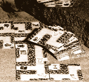 Ein Legespiel, um genau zu sein, und als solches nicht einmal besonders originell. Die 48 Kärtchen werden gut gemischt, die ersten vier beliebig zu einem Quadrat in der Tischmitte ausgelegt. Zwei Kärtchen bekommt nun jeder Spieler auf die Hand, der Rest wird als verdeckter Stapel in Griffweite gelegt.