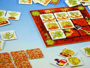 Das Erfreuliche zuerst: Wer eine Gießkanne aufdeckt, darf gleich noch zwei weitere Kärtchen aufdecken. Die Gießkanne kommt dann aus dem Spiel. Ansonsten darf immer nur ein Kärtchen aufgedeckt werden. Ist es ein Unkraut, dann kommt es in den eigenen Garten und wird in der nächsten Runde anstatt eines anderen Zuges wieder verdeckt zurück gelegt – eine andere Art von einmal aussetzen. Deckt man einen Schädling auf, wird man ein Gemüsekärtchen, das man bereits im Garten hatte, wieder los.