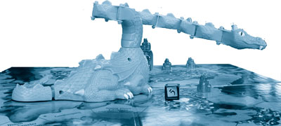 | Der Drache bewacht seinen Schatz und holt mit seinem riesigen Hals, der umher schlägt, nach den Eindringlingen in seine Höhle aus. |