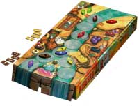 Wie aber kommt man im Normalfall an die begehrten Klunker und auf dem Fluss überhaupt voran? Jeder Spieler hat dazu ein Set von sechs Paddelkarten und einer Wolke-Karte. Pro Runde wählt sich jeder Spieler eine dieser Karten aus. Jede kann nur einmal eingesetzt werden und bleibt auf einem Ablagestapel. Erst wenn die letzte ausgespielt wurde, steht einem das volle Set wieder zur Verfügung. Anders gesagt: Kein Würfelzufall, sondern taktische Kräfteeinteilung, denn die Paddelkarten erlauben Zugweiten von 1 bis 6. Um beispielsweise von einer Fundstelle am Flussufer einen Edelstein aufs Kanu zu laden, muss man zwei Punkte abziehen.