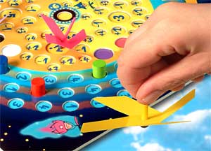 Landemöglichkeiten haben die Flugkreisel mehr als genug: Der gesamte innere Kreis des Spielplans mit den normalen gelben Feldern und einer Reihe an Sonderfeldern. Alle Felder sind ausgestanzt, so gibt es keine Diskussion, ob der Flugkreisel im Feld oder daneben gelandet ist. In jedem Loch ist eine Zahl samt Rechenzeichen: Plus, Minus oder Malzeichen. Irgendwie geht's ja ums Rechnen, aber nur unterschwellig. Zuerst einmal geht es (den Kindern) ums Gewinnen: Wer ist zuerst im Ziel?