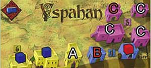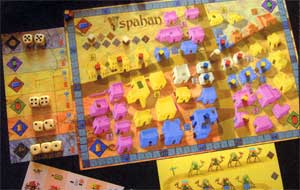 Bei Yspahan findet die Auseinandersetzung einigermaßen friedlich in den Gassen der ehemaligen persischen Hauptstadt (heute: Isfahan) statt. Die Spieler besetzen Läden mit ihren Warensteinen. Da gibt es große und kleine Stadtviertel, besser und schlechter gelegene Basare. Die Gestaltung kommt mit einem Minimum an grafischem Mitteln aus, und trotzdem ist der zentrale Spielplan optisch und funktional hervorragend gelungen. Auf Firlefanz, der sonst oft die Übersichtlichkeit beeinträchtigt, wurde hier zur Gänze verzichtet. Schön.