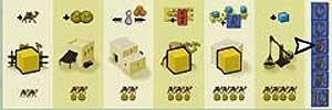 | Diese Spielertafel hat jeder vor sich liegen, sie zeigt die Gebäude. Spieler Gelb hat drei davon schon errichtet und profitiert jeweils von den erweiterten Aktionen. | |