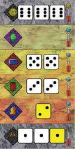 Yspahan spielt sich aber nicht nur in den Gassen der Hauptstadt ab, sondern noch auf zwei weiteren kleineren Spielplänen: Einem Karawanen-Tableau (hier haben wir die Verbindung zum Reiter von der Spieleschachtel) und einem Würfel-Tableau. Was sich hierauf abspielt, ist das Besondere, das Yspahan von thematisch verwandten Spielen abhebt: Mit einer Handvoll Würfeln werden die unterschiedlichen Aktionsmöglichkeiten des Spiels ermittelt und zur Verteilung unter den Spieler gebracht.