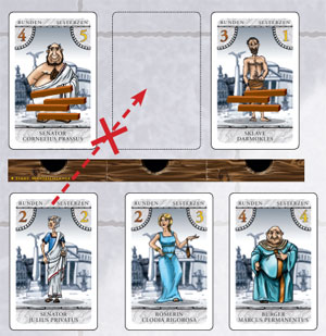 Das ist unterhaltsames Beiwerk. Wirklich entscheidend ist der Stand, dem die Personen = Karten angehören. Der gravierendste Punkt betrifft Sklaven und Senatoren. Niemals würde es einem römischen Würdenträger einfallen, neben einem Sklaven sein Geschäft zu verrichten, umgekehrt würde sich kein Leibeigener getrauen, neben einem Senator die Hosen runterzulassen. Diese beiden schließen sich aus, dürfen nicht nebeneinander auf der Latrine sitzen.