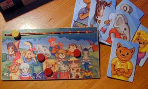 Vor fünf Jahren bei Sparito! war noch etwas mehr Materialaufwand dahinter: Die Holztafel hatte eine Kordel, an der man den Wertungsstein nachziehen konnte. |